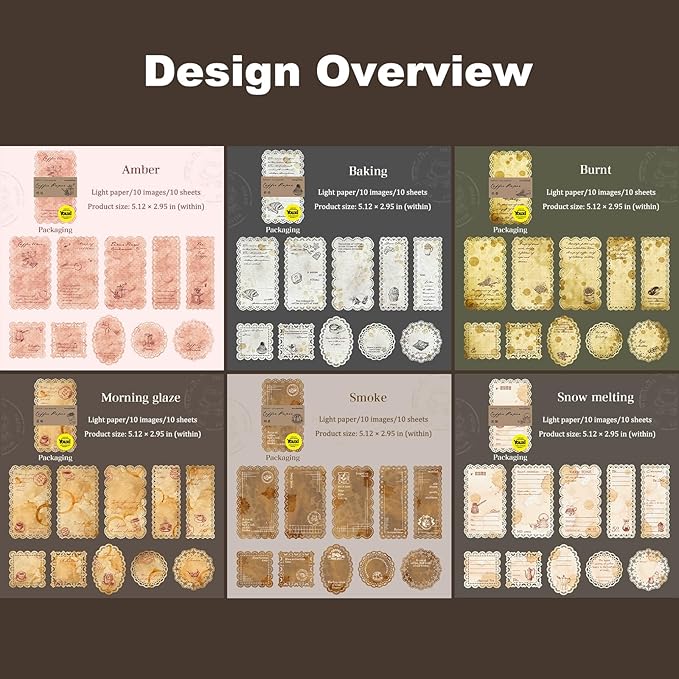 - Retro Coffee-Inspired Designs: This set includes 60 sheets across 6 styles, each with 10 unique lace-edged designs featuring retro coffee cups, text, stains, and patterns to add nostalgic warmth to journals and scrapbooks