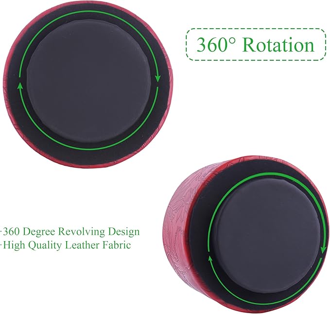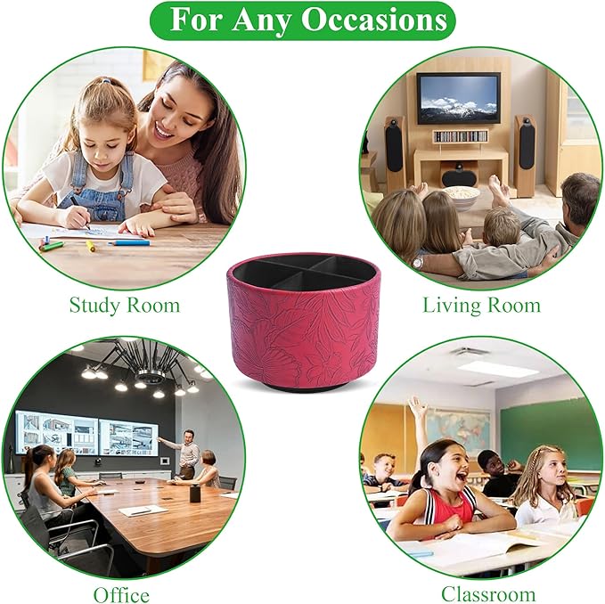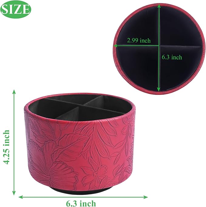 Hennaja Round Leather Art Supply Organizer,Remote Control Holder,360 Degree Spinning,Multi-Functional Pencil Holder,4 Compartments Desktop Stationary Organizer(1-Carved Red)