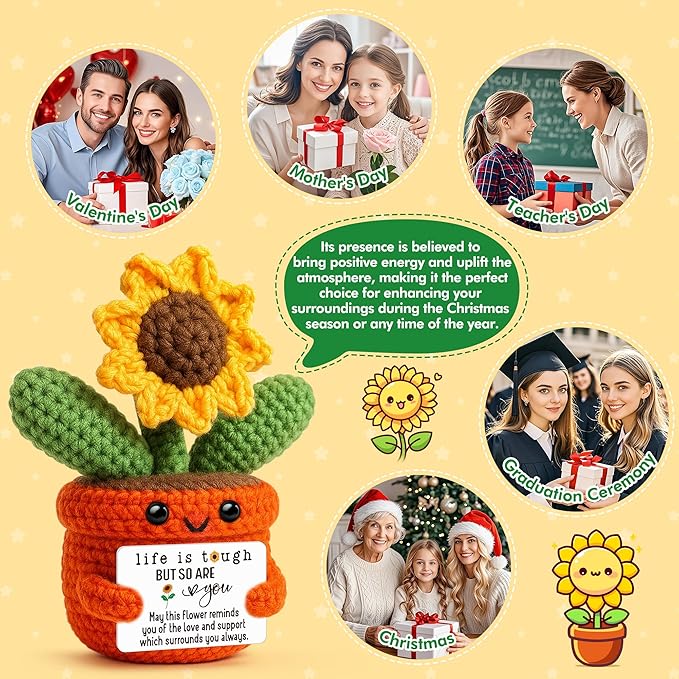 - Cheer Up Gift for Women and Loved Ones: This crochet sunflower flower potted plant carries the heartfelt message “life is tough BUT SO ARE you May this flower reminds you of the love and support which surrounds you always.” our motivational-themed gifts makes a special gift for women, friends, coworkers, or anyone in need of encouragement; ideal for those recovering from illness or facing challenges who loves plant. Inspirational gifts for her. She will cherish this gift forever.