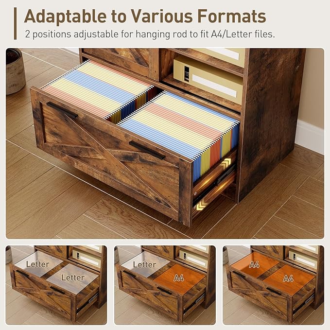 - Tidy Space: Morning light brings a fresh vibe with this farmhouse file cabinet. This filing cabinet measures 28.3"L x 15.7"W x 72.4"H and features 3 open shelves to organize books, files, and more. The barn door hides private stuff, and the big drawer with hanging rods stores A4/Letter files, handling all storage