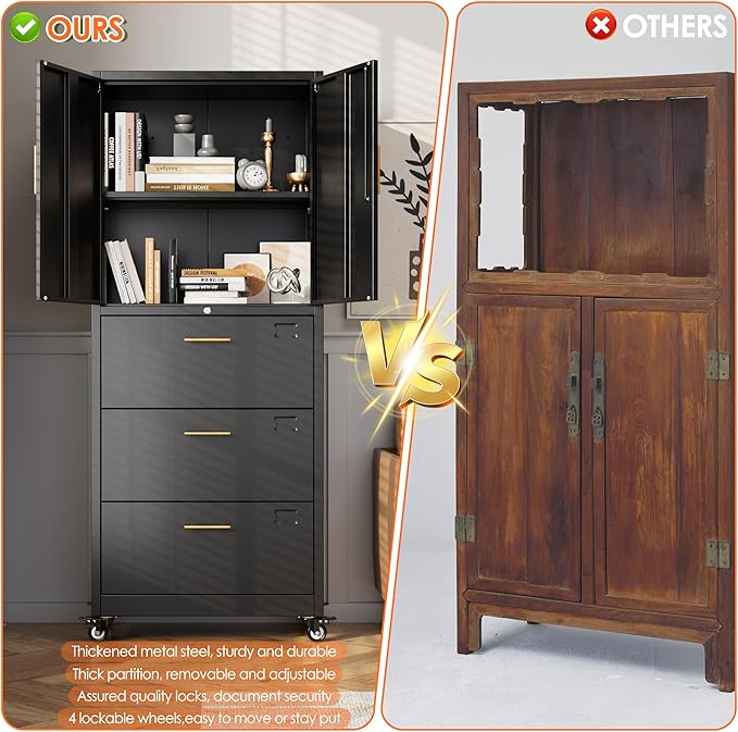 - Lockable Doors & 3 Drawers: Both the upper double doors and lower file drawer feature built-in key locks (or combination locks*) to safeguard personal belongings, office files, or sensitive documents from unauthorized access