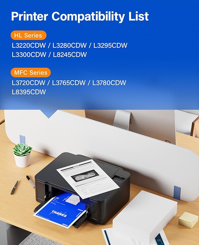 - Compatible Printer: Compatible with Brother HL-L3220CDW, HL-L3280CDW HL-L3295CDW, HL-L3300CDW, HL-L8245CDW MFC-L3720CDW, MFC-L3765CDW MFC-L3780CDW, MFC-L8395CDW Laser Printer (Please check that your printer model matches the printer model of this toner cartridge before placing an order)