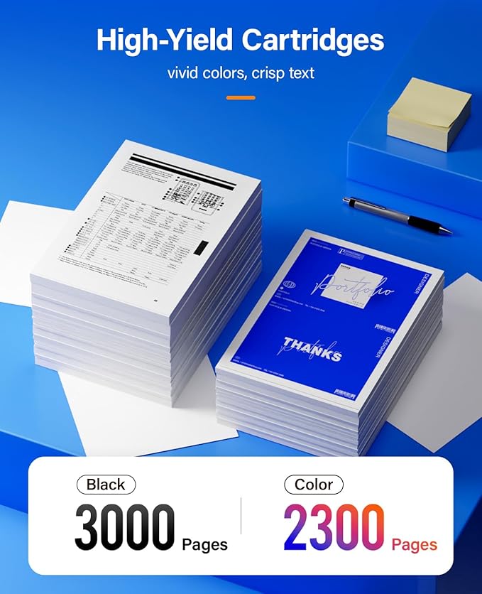 - Page Yield: Up to Black is 3,000 pages per black cartridge and Color is 2,300 Pages per color cartridge (Letter/A4, at 5% Coverage).