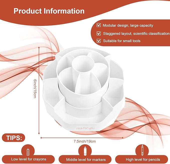- 【13 Storage Compartments with Modular Design for Multi-Item Organization】:Featuring 13 spacious compartments, this spinning pencil holder measures 7.48 inches x 5.51 inches and offers a modular design to help you store pens, markers, pencils, highlighters, paper clips, small tools, and more. The varied sizes and adjustable sections prevent items from toppling over, ensuring a neat and organized desk setup
