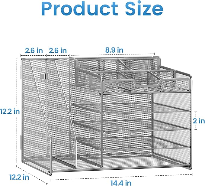 Lavatino 5-Tier Metal Mesh Desk Organizer with 2 File Holders & 7 Customizable Compartments | Paper Letter Tray for Office or Home Desk Storage | Keep Workspace Supplies Neat & Organized, Silver