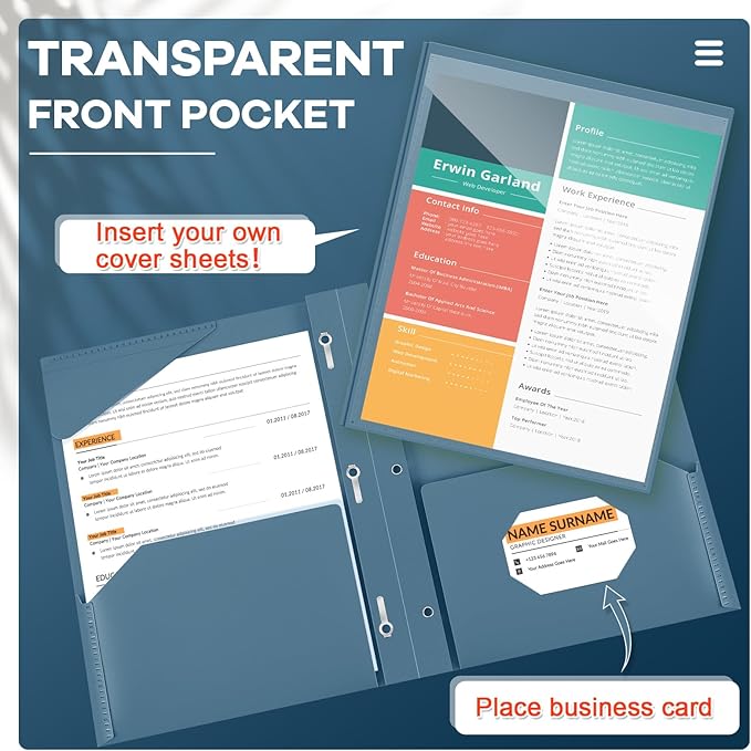 - Practical and Useful: with a clear front pocket, you can put your catalog, tables, favorite reports, presentations and more for clear display; Each plastic folder has 2 internal pockets to help organize and store your letter sized paper and documents, there are also 3 prongs to secure your 3-hole loose leaf paper, and the card slot can hold your ID card or business card, practical for your daily work