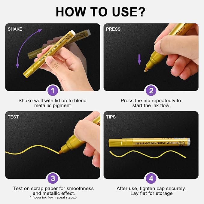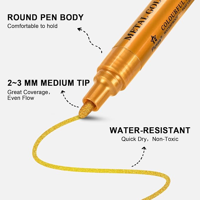 - 【Safe & Non-Toxic for All Ages】Metallic acrylic paint markers are crafted with water-based, odorless, acid-free ink that conforms to ASTM D-4236 safety standards. These metallic marker pens are suitable for kids, students, and adults—making them a fun, safe choice for family art painting and crafting projects or classroom use.