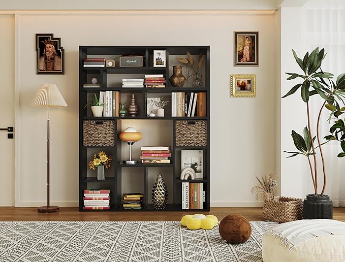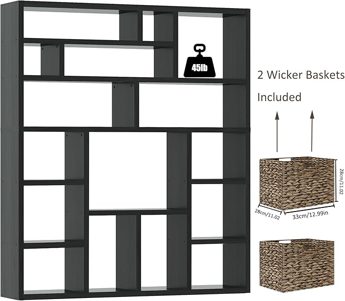 - 【Spacious Organization】71"H x 55"W x 11.8'' D dimensions for this large storage bookshelf. Maximizes vertical space with 16 versatile open compartments in graduated sizes. Effortlessly accommodates books, decorative objects, storage bins, and awkwardly shaped items for whole-home storage solutions.