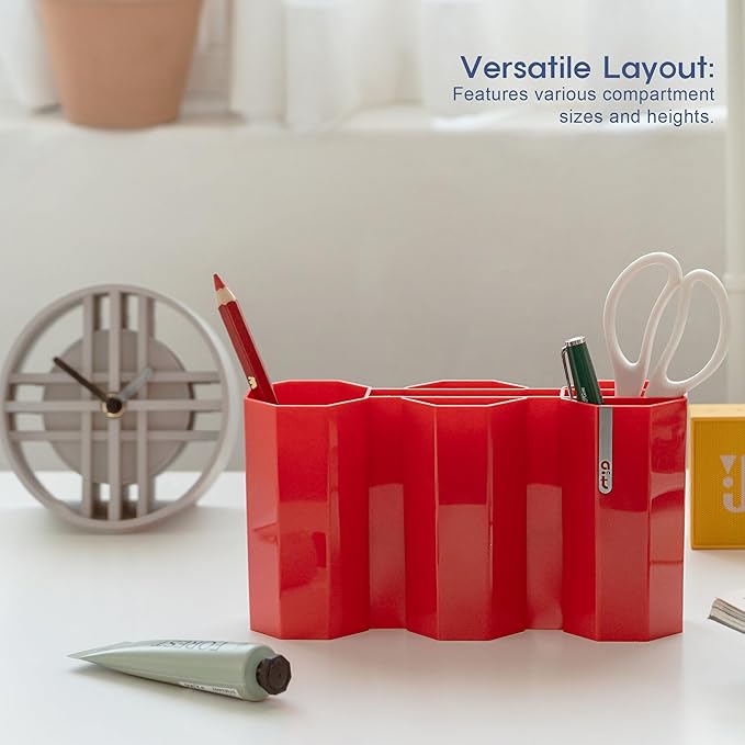 AonT Design Small Desk Organizer - Red Pen Tray & Holder (Multi-Compartment) (Made in Korea) – Modern Office Storage Supplies Organizer and Aesthetic Decor for Accessories