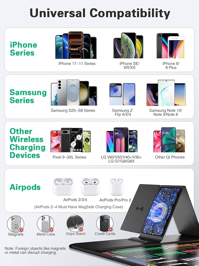 - Universal Qi Compatibility & Safety: Effortlessly power up all Qi-enabled devices including iPhone 17/16/15/14/13/12/11/XR/XS/8 Series, Samsung Galaxy S/S Note Series, Google Pixel, and AirPods Pro/2/3 (wireless charging case). Built-in safeguards provide protection against overcharging, over-current, over-voltage, and foreign object detection for complete peace of mind.