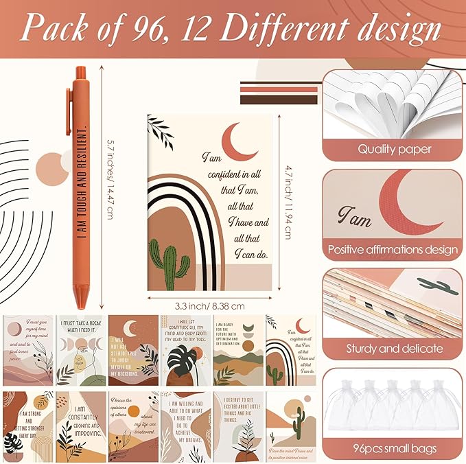 - Package Include: you will receive 96 pcs self care notebooks with 96 inspirational pens and 96 pcs small white bags, with this set, you can spread the joy of gratitude and positivity to multiple recipients, making it an ideal choice for bulk gifting