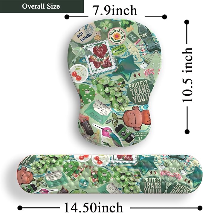 - 【High Quality】:The printing is clear and delicate, not easy to wear. The soft memory foam-filled cushion part will slowly bounce back when your hand leave it, not easy to out of shape.The keyboard wrist rest measures 17.32" x 7.87" x 0.98". The Mouse wrist rest measures 9.84" x 3.15" x 0.98".