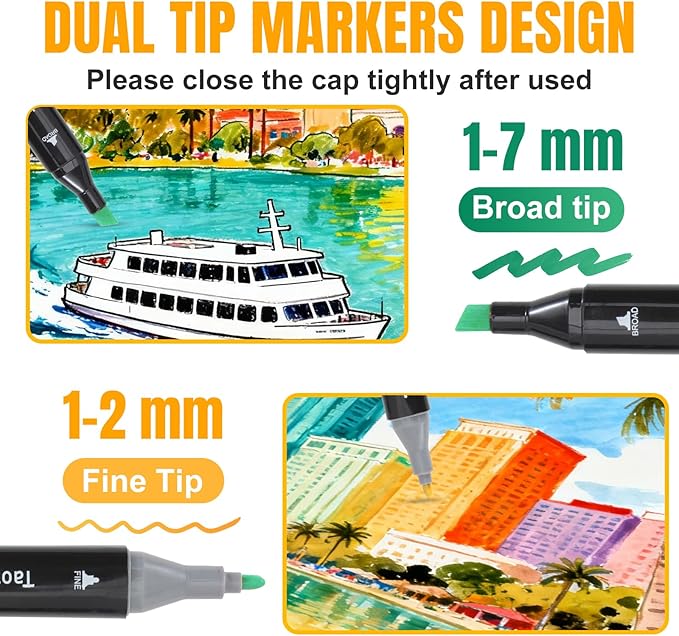 - Alcohol Markers: 100 Colors Black Penholder with Case & Holders, Double Tip Art Markers Set. These alcohol markers feature a dual-tip design, combining a fine point for precise detailing and a broad chisel tip for smooth shading and filling large areas. The fine tip is perfect for intricate linework, calligraphy, and technical illustrations, while the broad tip allows for quick, streak-free coverage in illustrations, manga, and graphic design.