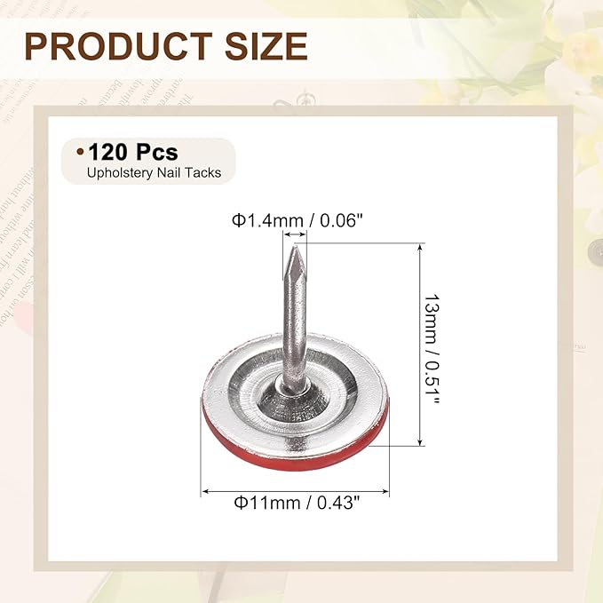 - [Size & Quantity] - The package comes with 120pcs decorative upholstery tacks. Sufficient quantity to meet your different daily needs. The overall size of upholstery nails is about 11mm x 10mm/0.43-inch x 0.39-inch(D*H)