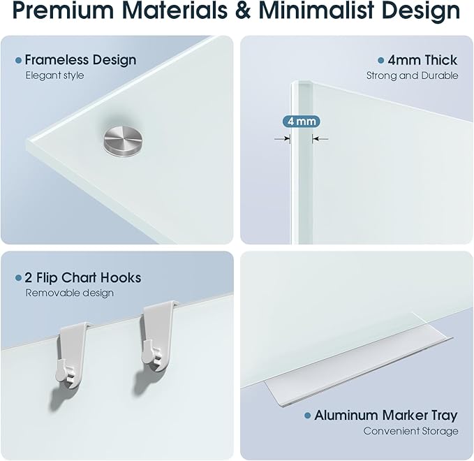 - Frameless Modern Design : Featuring a minimalist frameless floating design and craftsmanship, this board delivers smooth writing, effortless erasing, and a clear display, seamlessly enhancing your office, classroom, or home