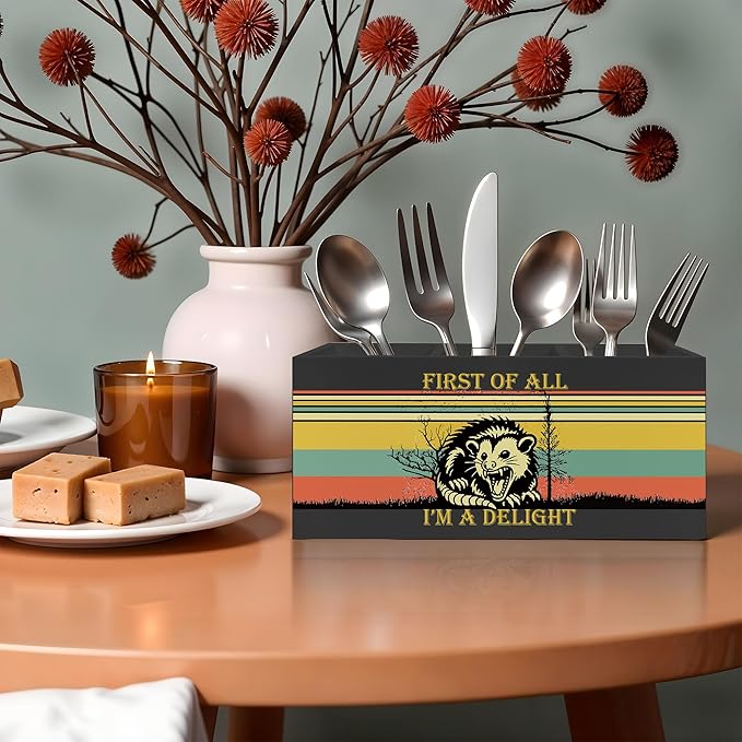 Sarcastic Angry Opossum Pencil Pen Holder for Desk, First of All I'm A Delight Wooden Pencil Holder Organizer for Home Office Desk Accessories, Funny Office Gifts for Women Men