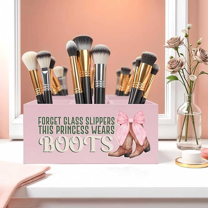 Coquette Pink Bow Cowgirl Makeup Brush Toothbrush Holder, Cowgirl Gifts, Pink Western Wooden Pen Pencil Holder Organizer for Home Office Desk Accessories, Western Gifts for Women
