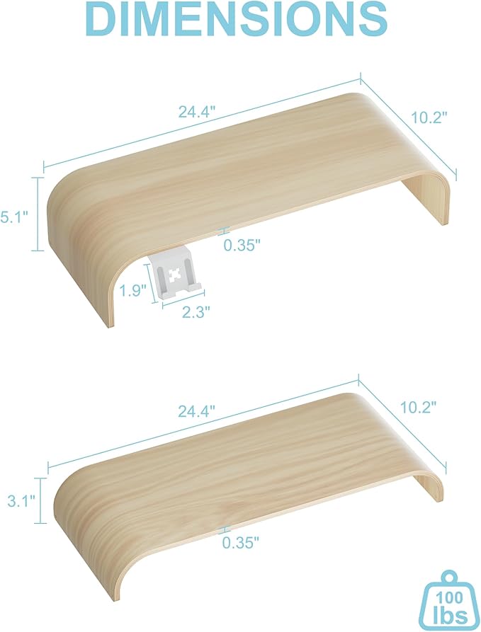 - Dual Wood Desktop Stand – Made of 0.4 inch thick solid wood, this dual monitor stand supports up to 110 lbs. The upper tier (24.4″×10.2″×5.1″) and lower shelf (23.6″×10.2″×3.1″) fit laptops, printers, and heavy desktop gear