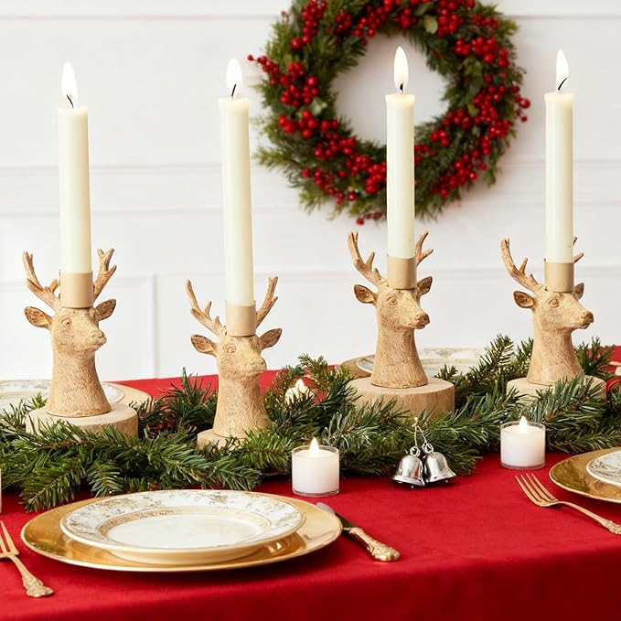 DN DECONATION Christmas Candle Holders Set of 4 – Reindeer Taper Candle Holders in Rustic Wood Color, Deer Head Candlestick Holders Holiday Tabletop Decor for Living Room, Fireplace, Party & Gift