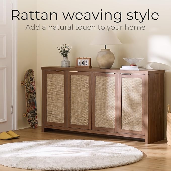 Walsham 61'' Buffet Cabinet with Storage, Adjustable Shelf Sideboard Rattan Entryway Console Cabinet with Doors Modern Credenza Coffee Bar Station for Kichen Living Room Holds 410lb Special Walnut
