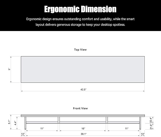 - Rock-Solid Stability:42.5 × 9.3 × 4.7 in overall size, 0.7 in / 18 mm thick panels, full-length steel core. 0.31 in / 8 mm premium acrylic legs deliver a 99 lb / 45 kg load capacity—effortlessly supporting heavy monitors or large laptops.