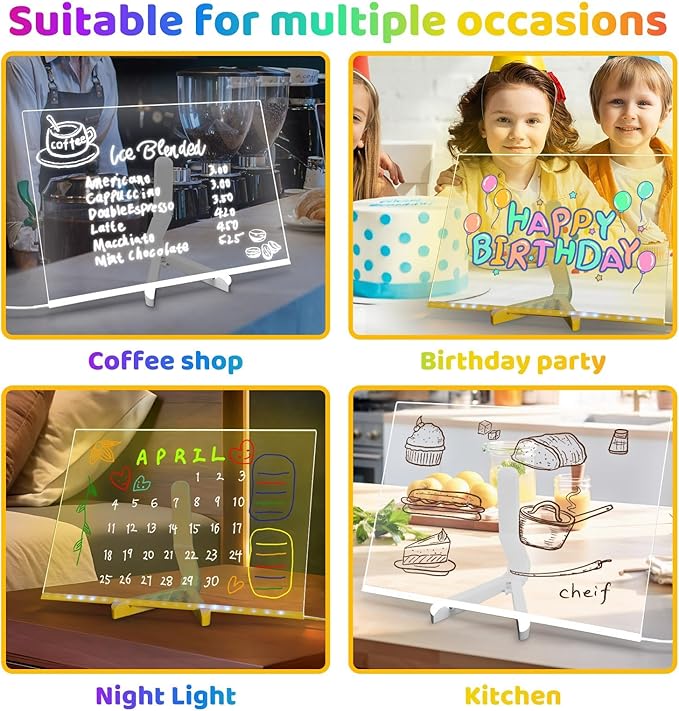 - Widely Used: This acrylic board with colorful light has a wide range of uses, which can be used as a dry erase board to record notes and to-do items, and can also be used as a drawing board and a doodle board for creative expression. Light up drawing board for kids can also serve as a cafe menu board, family chores chart, vision board, planning board, notepad or calendar and other roles. Whether home, classroom, office or shop, LED light up board for kids can be easily integrated and play an important