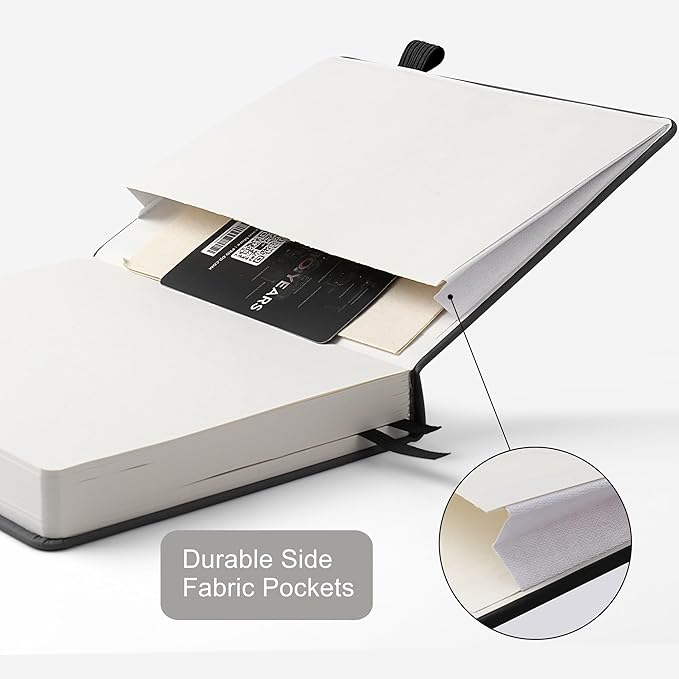 - 【Premium Cover & Humanized Design】Made from top-quality vegan leather, it's eco-friendly and odor-free. The waterproof feature ensures that your journal is protected from accidental spills and moisture. It boasts 2 elastic bands for a secure, flat close, 1 pen holder to keep your pen company.1 expandable practical pocket is used to store loose notes, business cards, receipts, sticky notes, or other small items, which is easy to access. perfect for writing, note-taking, daily use.