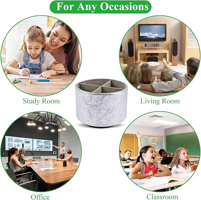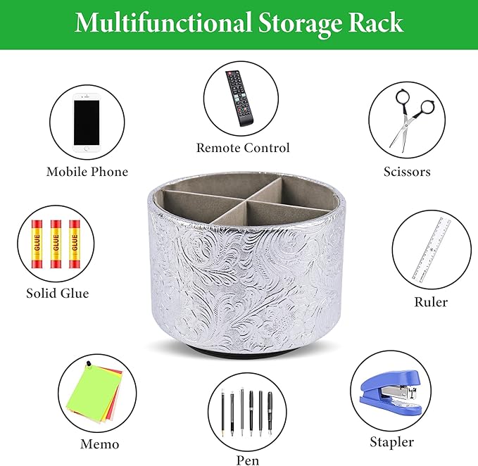 lizimandu Round Leather Art Supply Organizer,Remote Control Holder,360 Degree Spinning,Multi-Functional Pencil Holder,4 Compartments Desktop Stationary Organizer(1-Carved Silver)