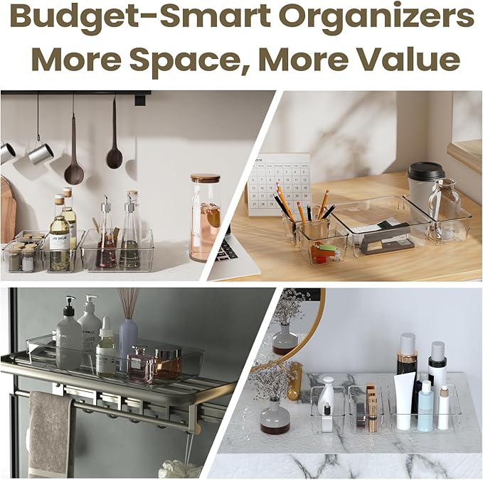 6 PCS Clear Plastic Drawer Organizer Set, 2 Sizes Acrylic Drawer Storage Trays Non Slip Storage Bins for Makeup, Jewelry, Gadgets for Kitchen, Bedroom, Bathroom, Office