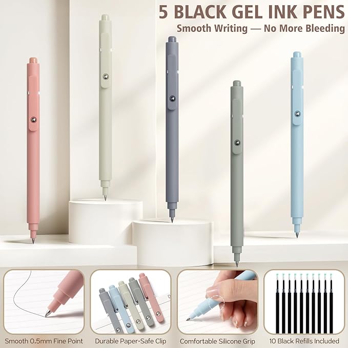 • 0.5MM FINE POINT BLACK & COLORED GEL PENS WITH REFILLS: This cute back to school supplies aesthetic office supplies teacher supplies includes 5 black gel pens with soft steel-ball clip grip for a comfortable hold, plus 10 black ink refills for extended use. The nursing college school essentials for teen girls students also comes with 6 vibrant 0.5mm colored gel pens & 6 matching refills. Clean, skip-free lines with fast-drying, no-smear ink—your go-to pen for study, notes, plans & creative ideas