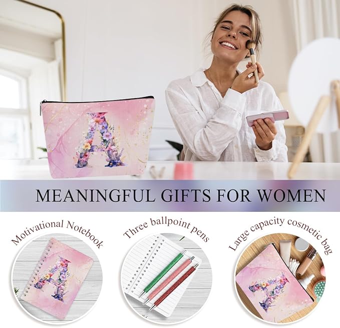 - Sufficient Quantity Personalized Gifts:This 6-pieces Letter surprise gift perfectly combines practicality and cuteness, making it an excellent choice to convey your heartfelt feelings! Our monogrammed gifts for women set contains a range of items; you will receive 1 x 20oz Tumbler with lid, 1x Notebook, 3 x push-on Glitter Ballpoint Pens, and 1 x Cosmetic Bag; the set is large enough to meet your gift needs.
