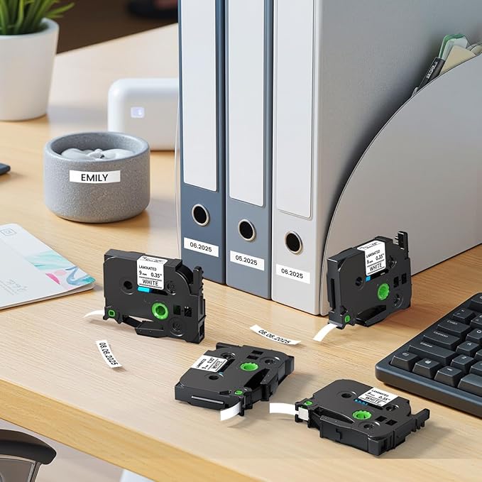 - [Wide Application] Tz tape 9mm 0.35 laminated white is good addition for business, home, office, retail shop, warehouse and more. TZe221 label tape is great ideal for labeling kitchen, shelving, cabinets, files, folders and accessories.