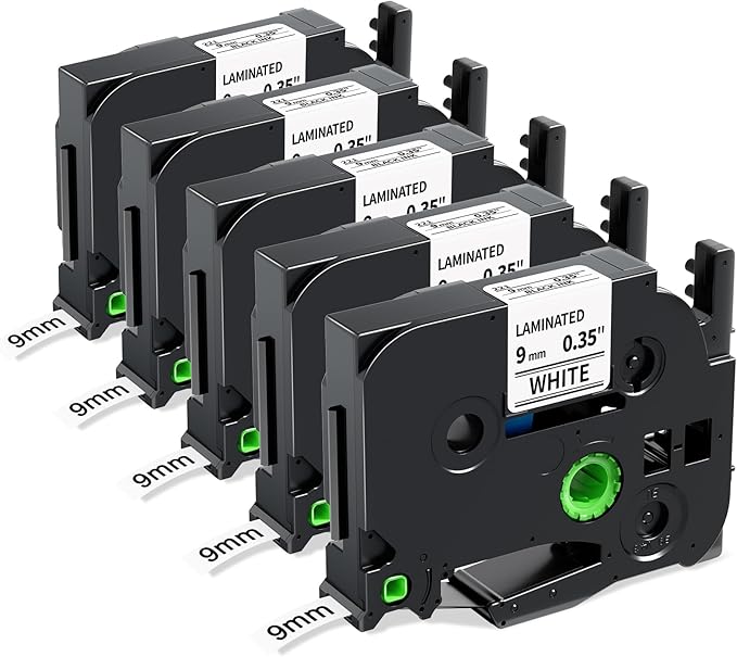 - [Package] 5 packs compatible brother p touch tze 9mm label tape TZe-221 (TZe221 TZ-221 TZ221). Width: 3/8 inch (9mm 0.35 inch). Length: 26.2 feet (8 meter) for each label maker tape. Color: black on white