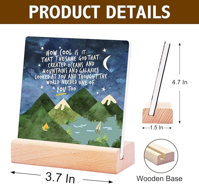 - [Perfect Size]:The desk decor expressing positivity measures 3.9*3.9*0.24 inches and comes with wooden stand which is convenient for you to put it besides your computer or table lamp on the table and shelf.