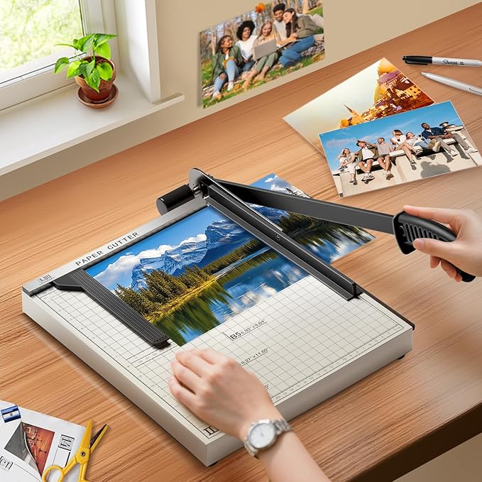 - [Large B4 Cutting Capacity (12" x 15")]: This Guillotine Paper Cutter Features an extra-large B4-sized bed (12" x 15" / 30cm x 38cm) with dual cm/inch scales. Pre-marked guides for A4, A5, B4-B7 sizes let you cut common formats instantly—no measuring needed.