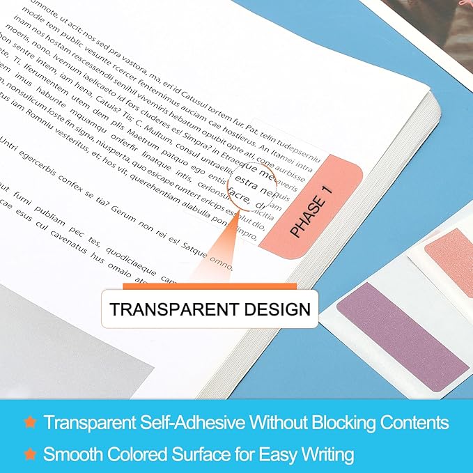 - Advantage: Half transparent design ensures that the text content is not blocked, while the other half of the colored area is used for writing or marking, taking notes without affecting the reading of the original text. Special adhesive back, no residue when removing the index tab, and it will not damage the paper, keeping it neat and tidy. Provide a variety of color options, classify and mark according to personal preferences and needs, improve the efficiency of organizing.