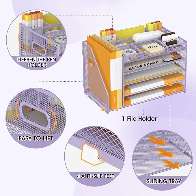 5 Tier Paper Letter Tray with File Holder and 3 Drop-in Pen Holders, Mesh Desk File Organizer with Handle, Desk Organizers and Accessories for School,Home, Office Supplies Storage-Purple