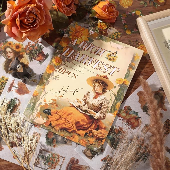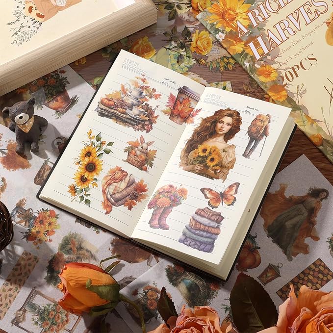 - The stickers are already cut into the right shape, so they're easy to put on. They stick firmly and don't leave any residue when you take them off. The sticker images are clear and bright, and they look beautiful. You can add a beautiful, personalized artistic touch to your life and creations with various patterns, such as sunflowers, chrysanthemums, flowers, pumpkins, butterfly women, and a variety of summer and fall landscape stickers!
