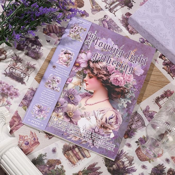 - Our vintage scrapbook stickers feature a variety of motifs, including women, girls, purple flowers, plants, flower pots, bicycles, castles, and tables and chairs. Use these stickers to personalize your scrapbook pages. They add color, texture, and visual interest, making your scrapbook look better.
