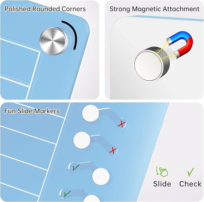 - Sleek Magnetic Acrylic Design: Made with premium clear acrylic and strong built-in magnets, this modern chore chart securely attaches to any flat metal surface like the side of a fridge. Its clean, minimalist look blends into any home decor while keeping daily plans visible for kids and parents alike.