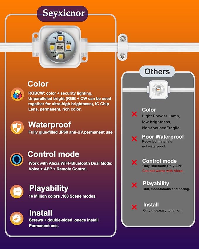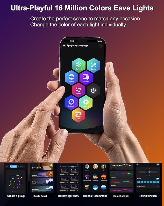- Smart permanent lights with independent control RGB IC: Our permanent outdoor lights have RGB IC lamp beads that can independently DIY control bulbs. This addressable LED smart light is different from other powder light beads. It uses an IC design, with a 50% increase in color vitality and a 90% increase in life. It has 16 million adjustable colors. You can set each bulb to a specific color individually and create countless lighting scenes and share it with the APP community!