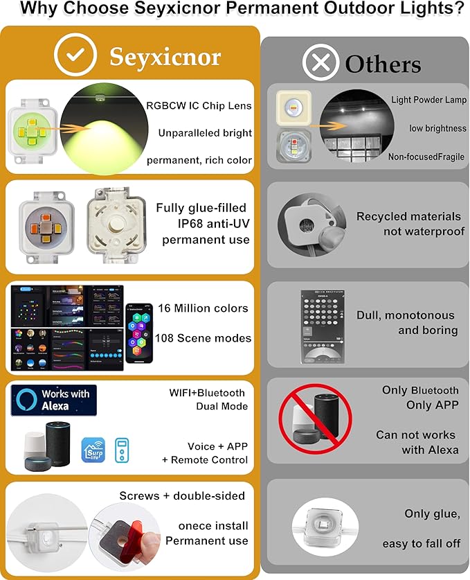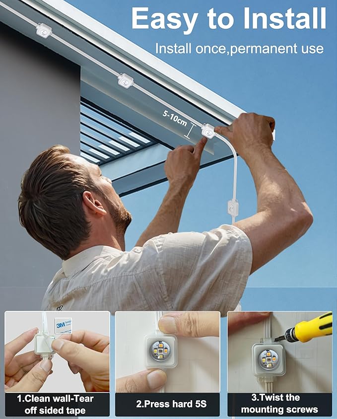 - Superior Value with Permanent Outdoor Lights for House: Higher LED density & optimized power deliver bright, even coverage. Easy peel-and-stick setup—install once on eaves, fences, or patios, and use the included screws and clips for lasting waterproof stability. Say goodbye to frequent replacements. Ideal outdoor christmas lights for House, New Year Halloween, Valentine's, Independence Day and more. A long-lasting, premium gift for any loved one.