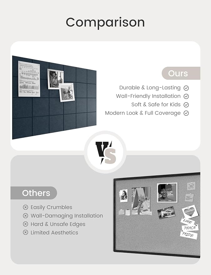 - 【Felt Bulletin Board – 12 Tiles Included】 Includes 12 felt cork boards (each 11.8" x 11.8") with 30 Pushpins that can be freely arranged into a large display board. Perfect for showcasing your schedules, ideas, and creations in home or office settings.