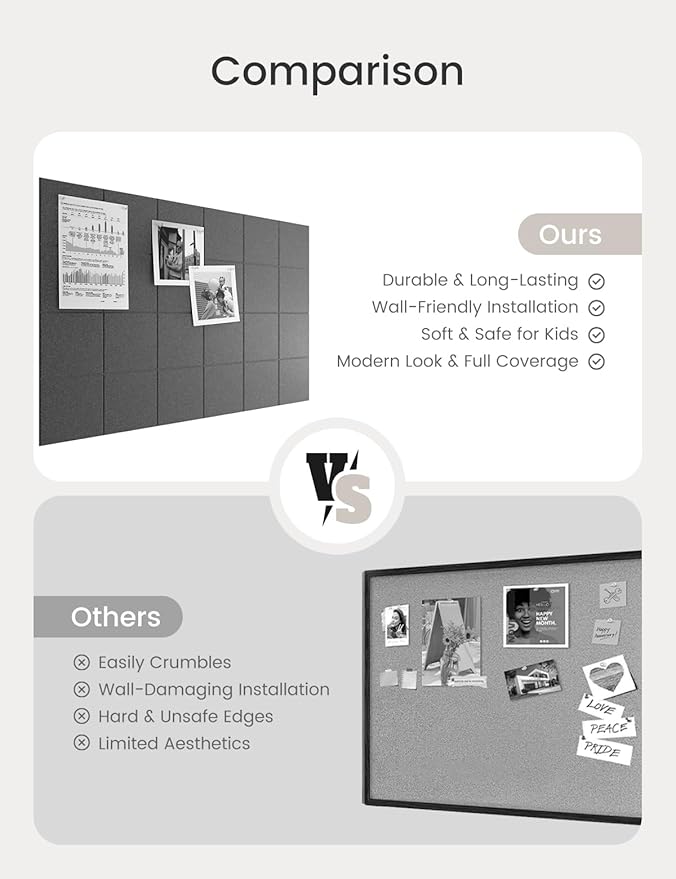 - 【Felt Bulletin Board – 12 Tiles Included】 Includes 12 felt cork boards (each 11.8" x 11.8") with 30 Pushpins that can be freely arranged into a large display board. Perfect for showcasing your schedules, ideas, and creations in home or office settings.