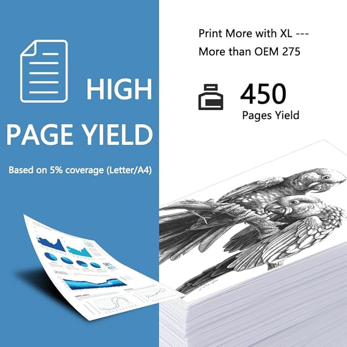 - Page Yield: Print More with XL --- Up to 450 pages per 275XL black ink(5% coverage)