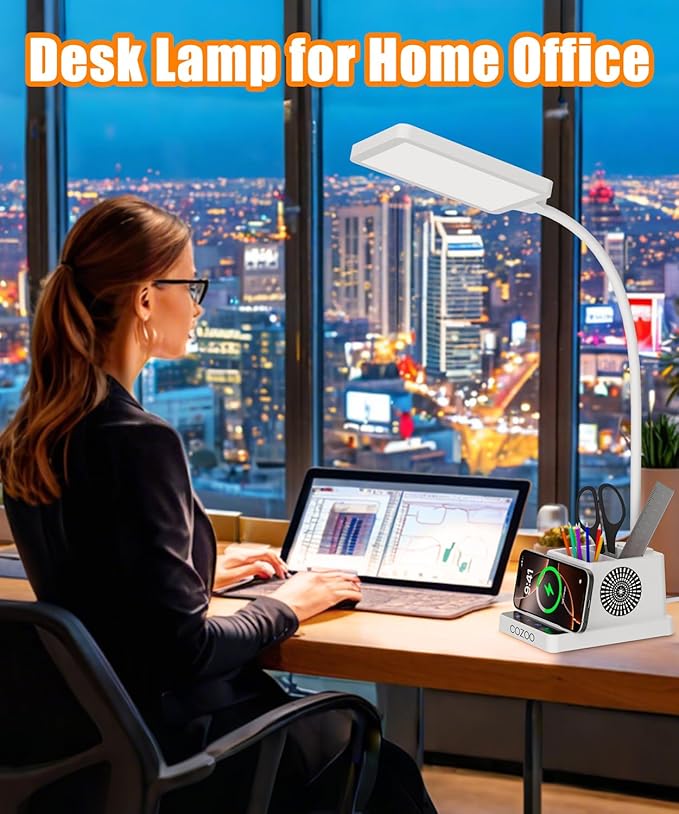 cozoo Desk Lamp, LED Desk Lamps for Home Office with 15W Wireless Charger/Organizer,Desk Lamp for College Dorm Eye-Caring Study Light,Gooseneck Table Lamp with Pen Holders/Storage,12 Lighting Modes