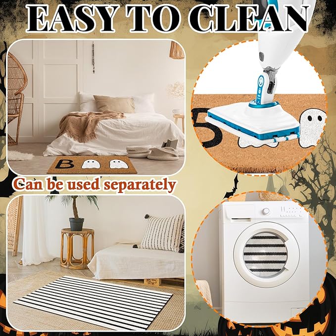 - Quality Materials: cute ghost outdoor welcome mats constructed from coconut fiber, the pumpkin doormat offers durability and weather resistance, making it a good choice for an outdoor mat; The black white stripe rug is made from a blend of cotton and synthetic fibers, known for their soft yet robust qualities; Together, these fall mats will become a long lasting fixture of your home decoration