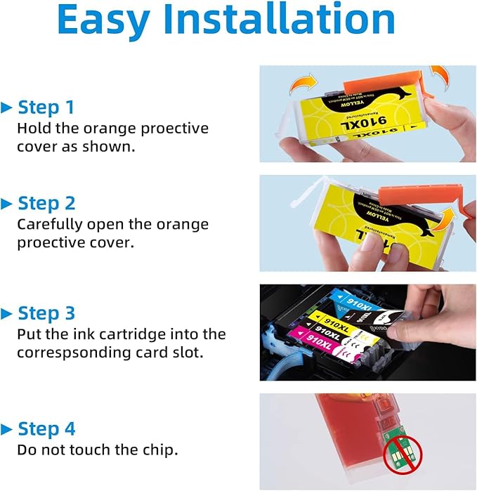- Package Content: 910xl black ink, 910xl cyan ink, 910xl magenta ink, 910xl yellow ink (black and color combo pack, totally 4 packs 910 ink cartridges).