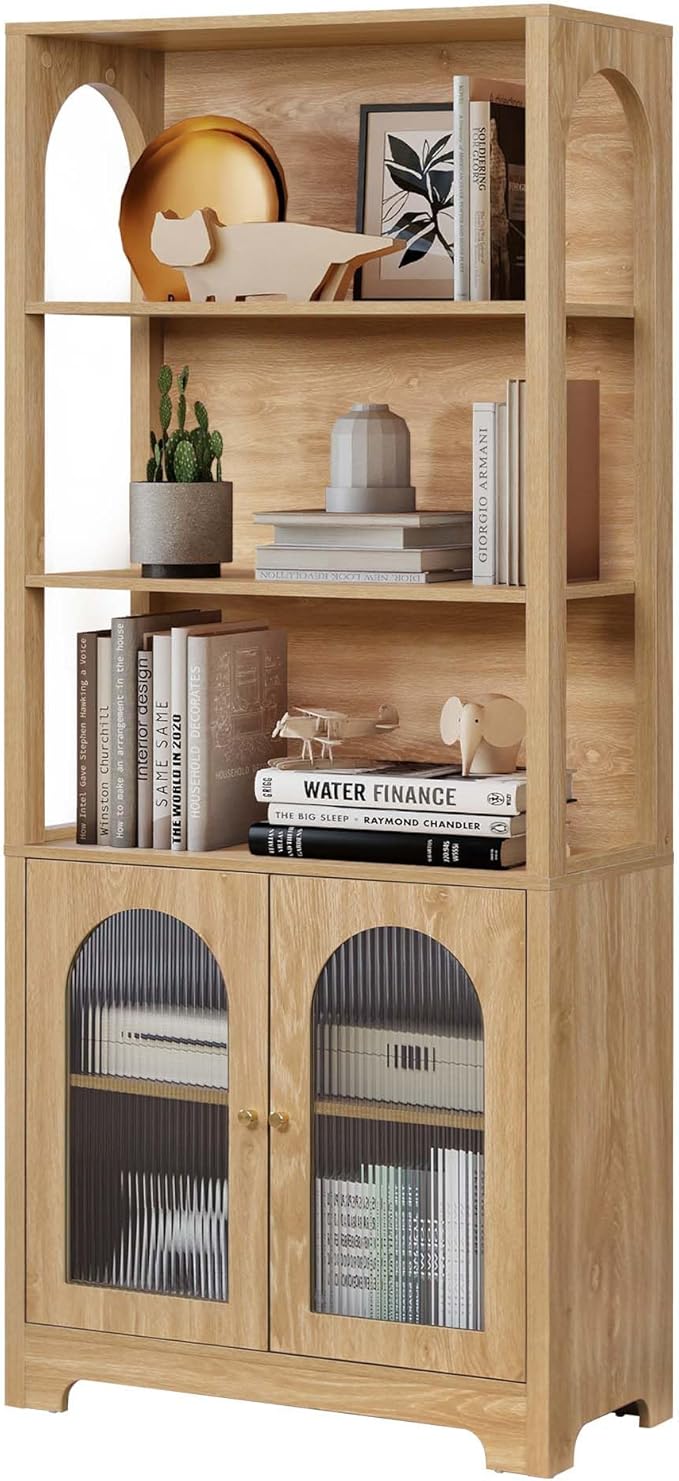 RARZOE 71" Tall Bookshelf and Bookcase, 5-Tier Arched Bookshelf with Glass Doors, Floor Standing 5 Shelf Book case, Wood Display Cabinet Storage Organizer for Living Room, Bedroom, Office(Natural)