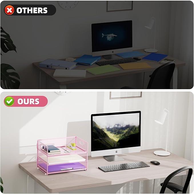 Marbrasse 3 Tier Paper Organizer Letter Tray, Mesh File Organizer with Handle, Paper Sorter Desk Organizer for Home Office Supplies - 2p Pink